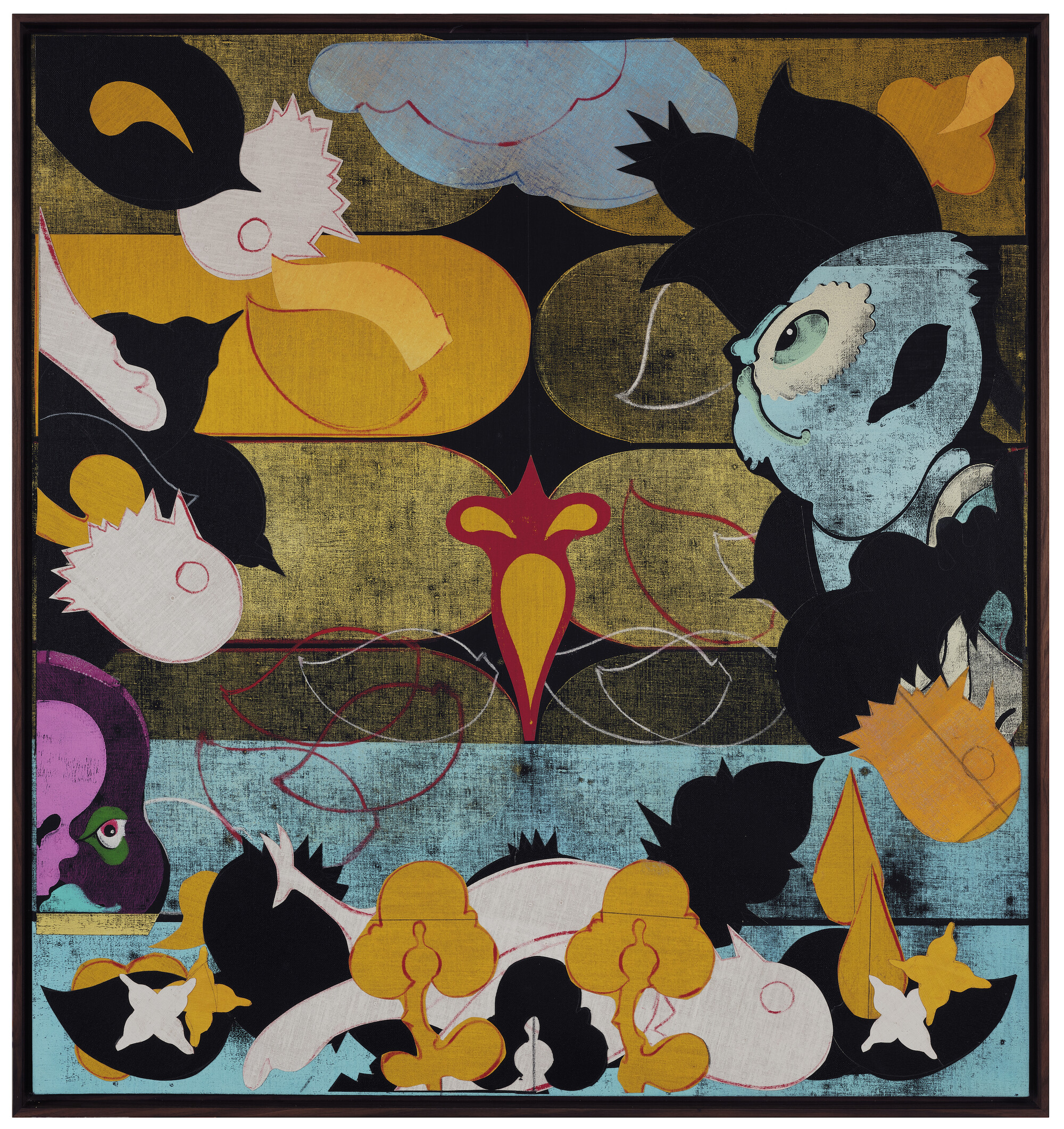 Born in Transylvania, Romania in 1973, the twin brothers Gert & Uwe Tobias currently live in Cologne, Germany. Over the past twenty years, they have developed a four-handed body of work, whose conceptual and production process is unique from every point of view. Their artistic experiments have explored the fields of woodcut, typewriter drawing, gouache, watercolor, ceramics and lacemaking, yet their basic principles of production remain unchanged. With the passage of time and the development of their oeuvre, nourished by this continual back and forth between the various techniques and forms of expression, their lexical corpus of characters, animals, artifacts and other elements—in other words, Gert & Uwe Tobias’s “things”—has become a veritable caravanserai, which they parade endlessly before their eyes. So today, we find them cutting out forms from their earlier canvases to explore other possible combinations. Thus, new shapes and figures have appeared, while others seem to disappear. It is true that Transylvania, their place of birth, is considered by some as the land of vampires. Notions of non-existence and existence, night and day, sleep and wakefulness, repulsion and fascination, constraint and pleasure, form and substance, all alternate naturally, sometimes in surprising and unexpected ways.