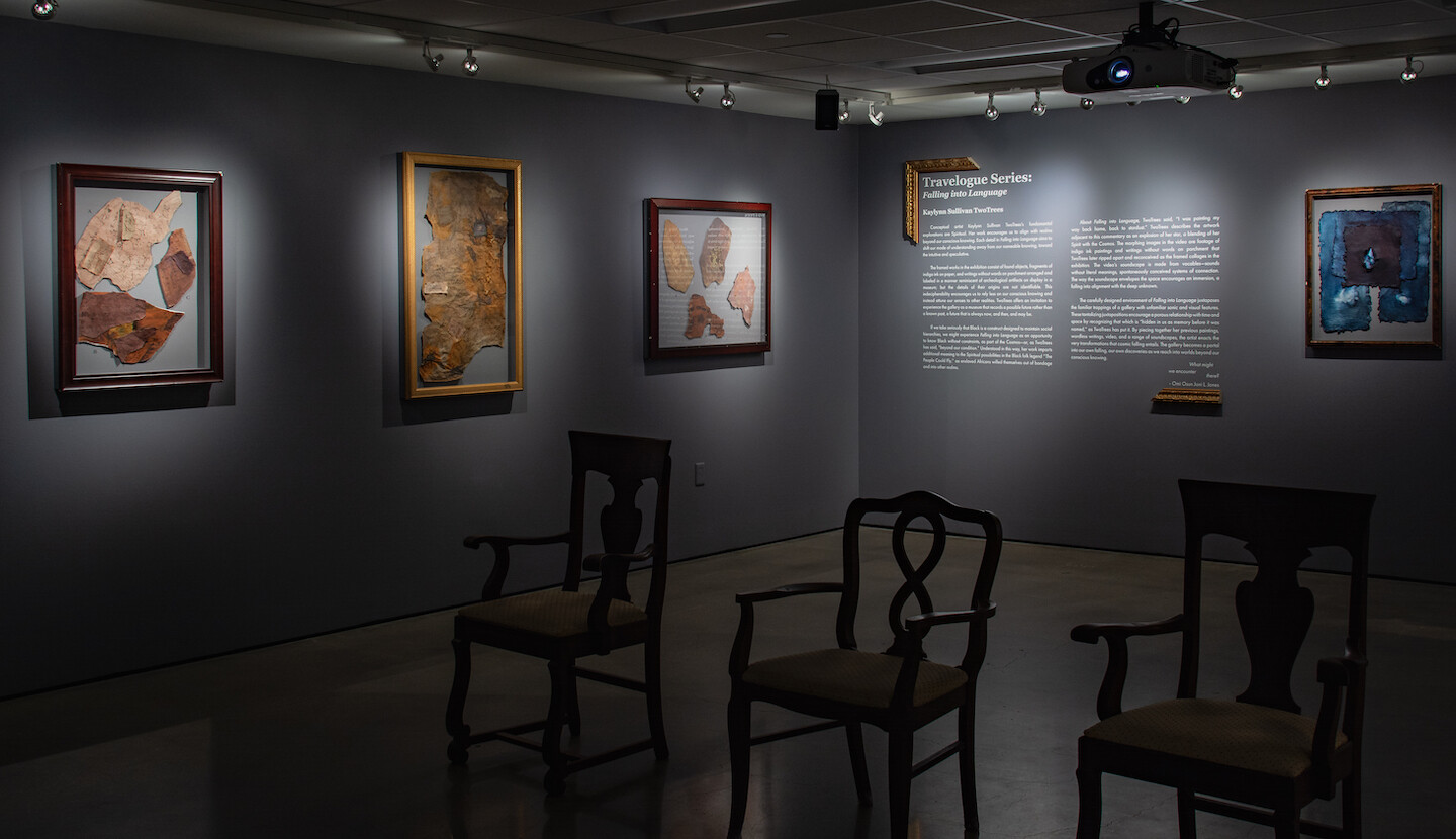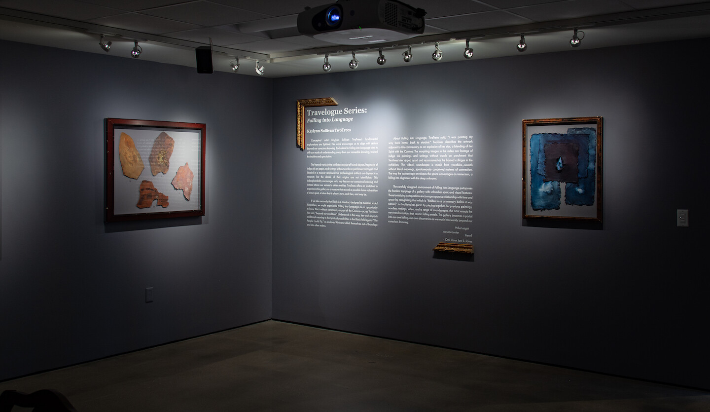 The iteration of Travelogue Series on view at AGBS offers viewers two worlds housed in separate but complementary exhibitions. Falling into Language offers framed works on paper and found objects that suggest archeological finds with unspecified origins, presenting viewers with the opportunity to speculate about the origins of humankind. The exhibition also includes a video consisting of morphing images and a soundtrack of vocables—sounds without literal meanings—recorded around the world. These works create an environment that encourages immersion and falling into alignment with the deep unknown.