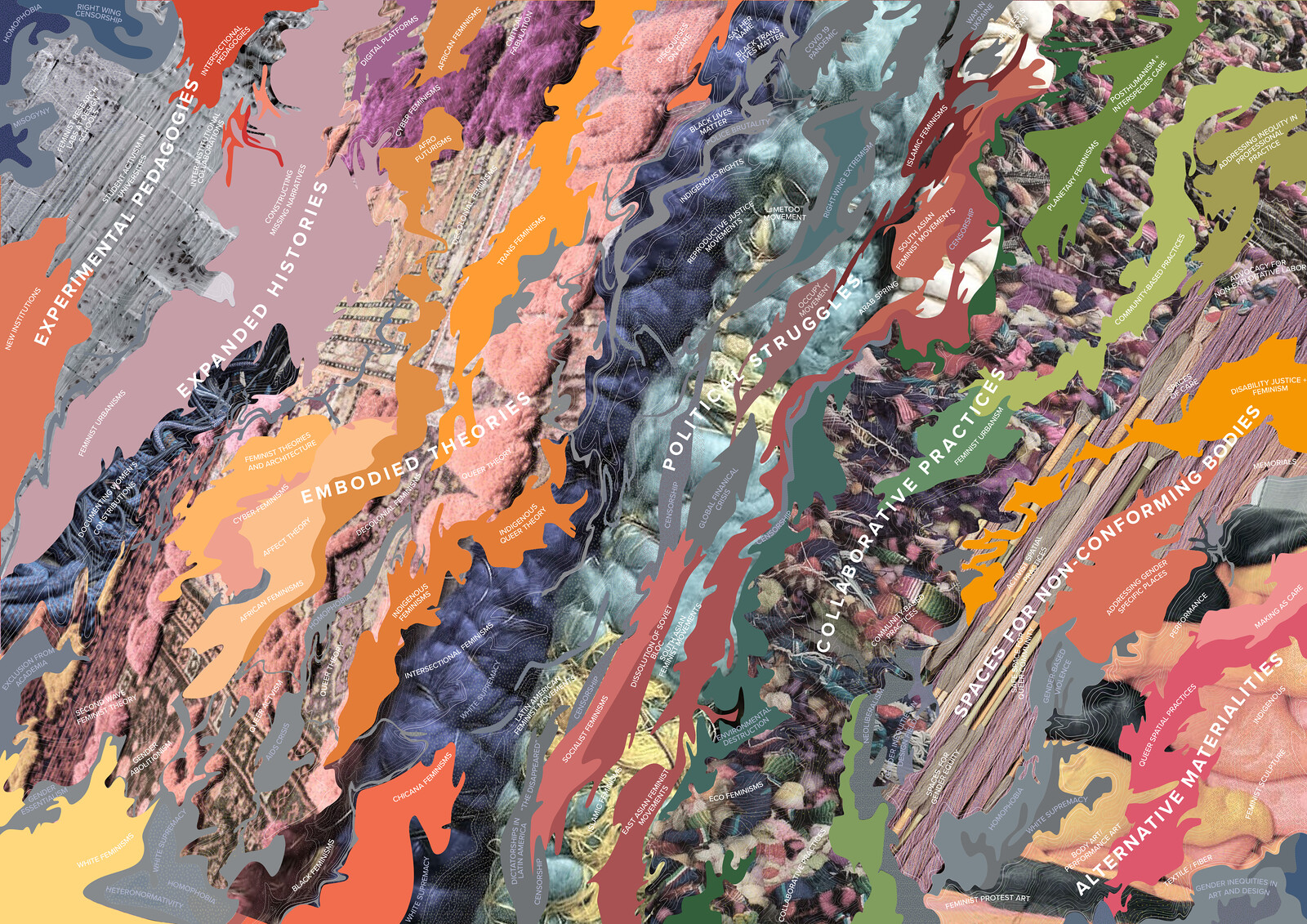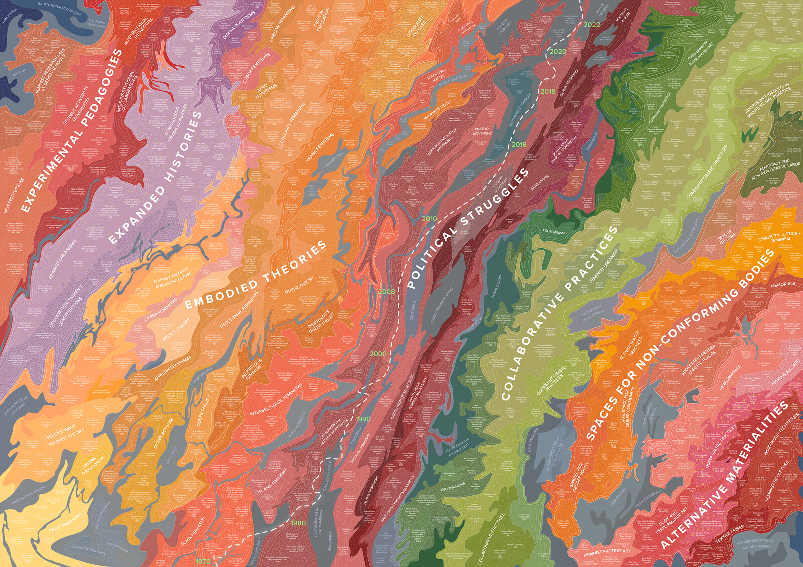 The diagram was created through an interpretive process of visualization based on these conversations and feedback. The resulting visualization is a landscape of ideas and practices: a relational terrain of parallel, interrelated, and sometimes conflicting modes of feminist spatial practice. Inspired by geological maps, the diagram shows landforms of converging ideologies and activism that rise from seas of oppressions. The land masses morph over time, expressing the shifting relationships between activist movements, theoretical discourses, and modes of spatial practice, focusing primarily on contemporary practices, yet with nods to earlier influential projects and practitioners. Time travels along a diagonal axis of political struggles beginning in the late 1960s and moving to the present, indicating that political crises are often precipitating factors for feminist movements and discourses. The landscape also runs off the page in all directions, inferring that feminist spatial practices happened before the frame of this landscape and will continue to happen afterwards. Peaks of theory and practice emerge, but exist in all time periods and landscapes, showing ever-expanding relational conditions rather than hierarchy.