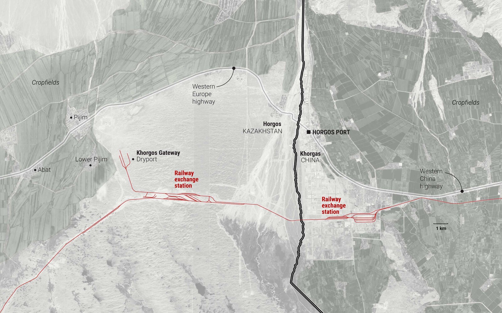 Located in the Panfilov district of Kazakhstan’s southern Almaty region, Khorgos sits across the border from China’s Xinjiang Uyghur Autonomous Region. Technically two cities sitting on opposite sides of the Sino-Kazakhstani border—Khorgos in Kazakhstan, and Horgos in China—the region contains several bilateral projects, including the International Center for Border Cooperation (ICBC), Khorgos-Eastern Gate SEZ, a hydroelectric plant, and new railway and road systems. The cities on both sides of the border have undertaken simultaneous development projects to support transit flows and further elite desires to transform the region into a “new Dubai.”4
