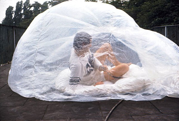 A detail of a prototype of Cushicle, an individual mobile living space by Archigram, here photographed with a dweller.