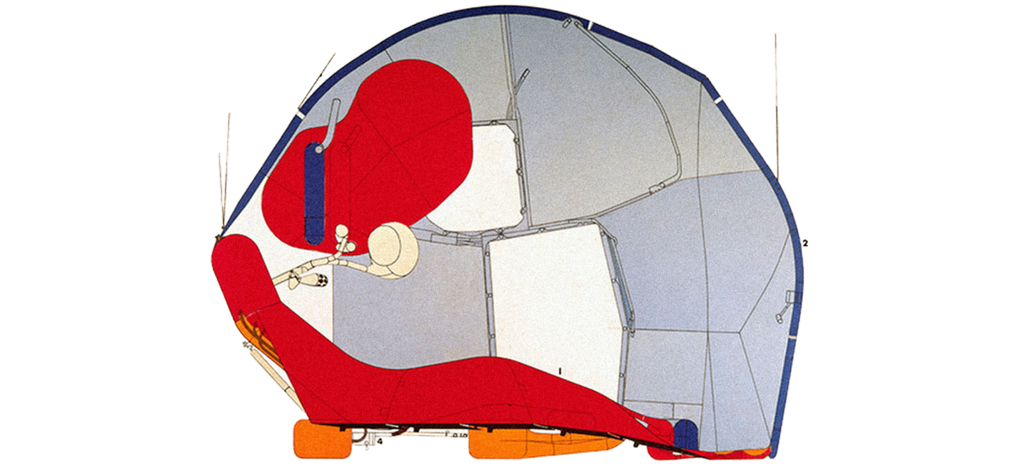 The Cushicle consisted “of a chassis with appliances and personalized apparatuses and an inflatable envelope. The chassis is structured like a spine and would include a heating system. The helmet would contain the radio and mini-TV. Food and water modules could be added to the chassis as attachments. The two skins would be envelopes for the rider, covered with viewing screens. The two could be used independently or simultaneously.” →