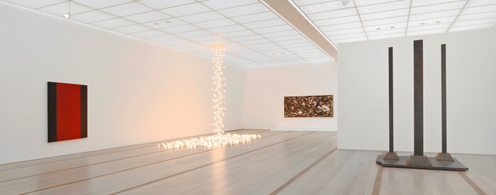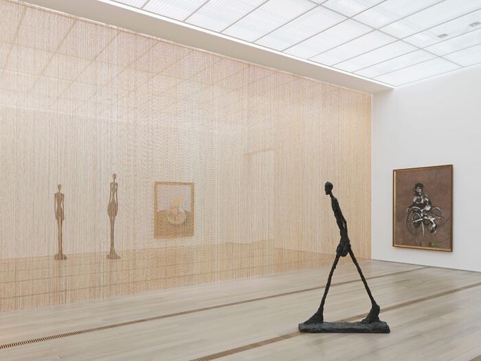 It’s an eccentric curatorial structure. At the Beyeler, for example, the curator decided to place Gonzalez-Torres’s works in direct conversation with the museum’s formidable (and unmovable) collection of modernist art. Thus, “Untitled” (For Stockholm) (1992), a waterfall of light bulbs and cords, falls to the floor near some Barnett Newman paintings and sculptures, mirroring the verticality of the Newman works while deftly defying their density and weight. Likewise, in the gallery of lily-pond paintings by Monet—separated by a glass wall from the actual lily pond outside—Filipovic placed a paper stack featuring the hazy surface of a body of water. The work transforms the monumentality of Monet’s paintings and Renzo Piano’s landscaping into something as temporal and elusive as a photocopied image. In contrast with the turbulent mental states projected in a room of Alberto Giacometti’s attenuated sculptures and Francis Bacon’s hallucinatory portraits, Gonzalez-Torres’s beaded curtain “Untitled” (Golden) (1995), seems pacific and infinitely private.