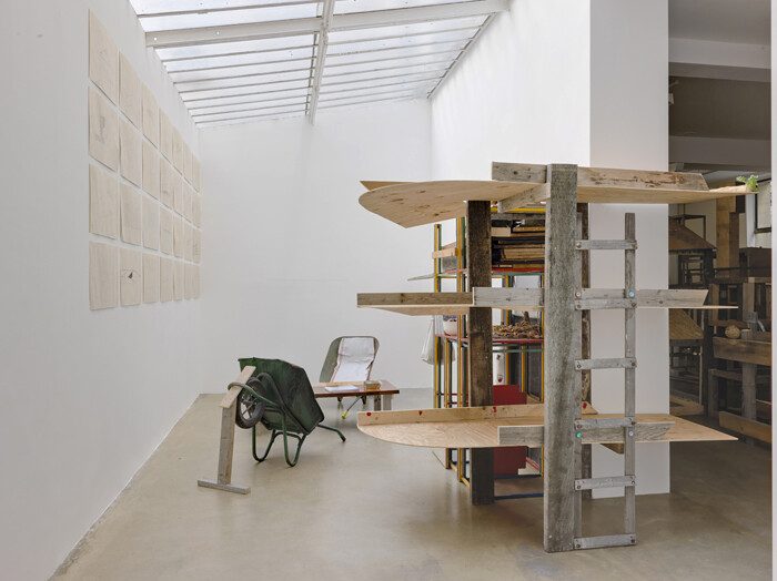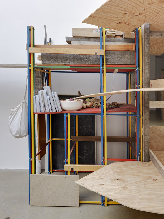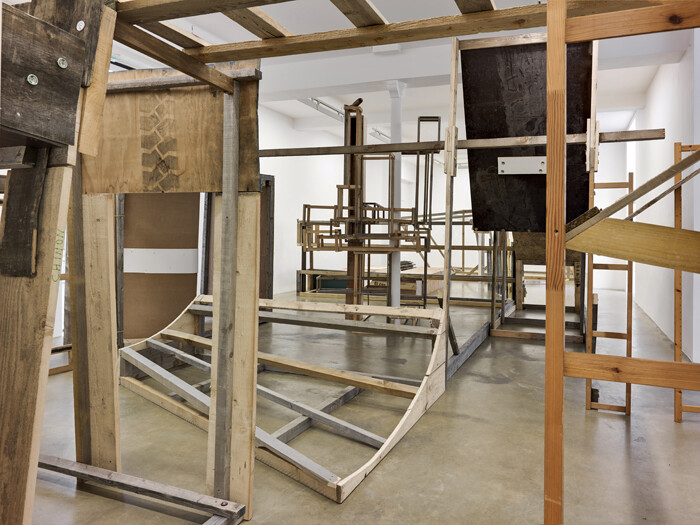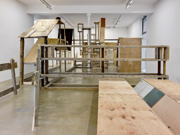 For the artist’s first solo exhibition at Galerie Chantal Crousel, he has filled the entire main gallery space with a circular, quasi-architectural construction, made exclusively of found materials such as scraps of wood. The open, somewhat labyrinthine, structure is at once reminiscent of a skeletal favela, a modernist stage set design or, finally, a rather vast, wonky, constructivist sculpture. Its transparent construction and seemingly ramshackle composition represent both a symbolic ideal of interior-exterior porosity and a practical reality of fabrication, indissociable from the artist’s biography. The artist grew up in Ajusco, a small, unofficial suburb of Mexico City, which, like a shanty town, was built from the ground up from found materials by its inhabitants. His method, which he calls Autoconstrucción—self-construction—is essential to his sculptural practice and on-going investigation of identity. In 2005, the artist moved to Paris for a residency, and subsequently spent three-and-a-half years in the city. While in Paris, he developed an interest in la petite ceinture—a train track which encircles Paris, and although disused, has come to represent the division between the city and its suburbs, and by extension, social, political, economic, and cultural issues of disenfranchisement—and the formation of identity vis-à-vis this urban and cultural frontier. Thus, in the months leading up to the exhibition, he conducted, with the help of a gallery assistant, a series of long interviews with local figures, ranging from knitters, community gardeners, and slam poets, among many others, who issue from a culturally and politically interstitial space, alien to clichés of Parisian identity. Along with photocopies of notes and images (Devo!), the interviews are collected and presented in the above-mentioned supplementary publication to the exhibition.