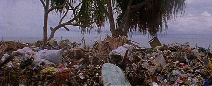 Smithson’s act of carrying the lineage of inspiration in his pocket is a well-chosen device used to set the scene, a tool similar to that of quoting. Sources of inspiration become co-conspirators, creating and reshaping the experience of the work. Similarly, Rivers is hardly shy when it comes to naming his inspirations, not that they could be overlooked. For his research he consulted the masters of post-apocalyptic fiction, from Victorian writers such as Samuel Butler, Mary Shelley, and Richard Jefferies, to Herbert Read and more contemporary representatives—JG Ballard, Jorge Luis Borges and Kurt Vonnegut. The four episodes in Slow Action, titled Eleven, HIVA, Kanzennashima, and Somerset each embrace their own common post-apocalyptic tropes of the classic science fiction paradigm. These coalesce the island’s inherent characteristics and pending potential; Eleven (filmed on Lanzarote), a crystallized world suspended between prehistory and future; HIVA (filmed on Tuvalu), an isolated island society that evolved apart from the rest of the world; Kanzennashima (filmed on the abandoned Japanese island Gunkanjima), a locale of the last men in an abandoned world; and Somerset (filmed on an unnamed location), the imminent island home to a clade of new savages. The film is thus more an ode to a genre than an independent work and less about creating something anew. Then again, the recurring thematic may be an ailment of the science fiction genre itself, grounded in the untrammeled nature of the subject, which has the ability to go forward as to go back. The last men on earth stray through the lands not unlike the first, with their trepid, bare existence epitomizing the Petri dish—the material from which the science fiction writer probes the limits of the scientific datum.