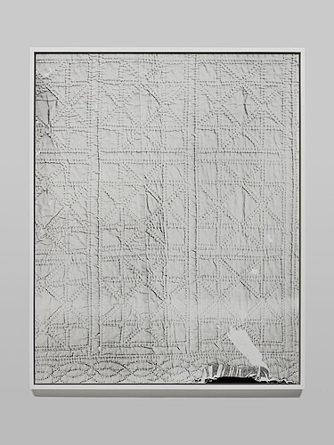 The show’s title, “Constant Comment,” is borrowed not only from the still-popular 1940s brand of orange pekoe blended by the Bigelow Tea Company, but also from the title of a large print of a white quilt which is the exhibition’s central figure. The pattern of the quilt maps a triangular motif of hard angles, reminiscent of the artist’s stacked mirrors and their slanted reflections, and, more obliquely, perhaps of the softness of the cloth in the aforementioned poet’s shirt. This photograph also begins a series for which the artist has employed a batch of aged, large-scale, black-and-white Polaroid stock whose chemical decomposition causes erratic faults and absences in developed pictures.