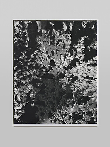 But in Constant Comment (2011), the image is largely intact. Only the bottom right edge is seared black, stitched to the photographic likeness of the quilt by tendrils of light. These stringy bits are actually chemical traces occurring in the liminal area between imprint and void; nevertheless, at first glance they look more like threads unraveling from the antique blanket, and in Forgetting (2011)—a more vastly corroded picture of ferns—they can be mistaken for botanic ornamentation, while the actual outlines of foliage are beneath, riddled with cavities that obstruct their view. Other more abstract works, like Portrait of Space (2011), call attention to the visceral materiality of the scratched, streaked, and erased film stock.