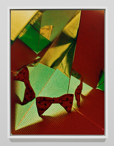 In a recent series Quinlan re-photographed identical stagings of mirrors, etc., but with different lighting palettes and arrangements. For Creep 1 and Creep 2 (both 2011) she has repurposed the same shot of the quilt in Constant Comment as a canvas primed for iteration. Then, there are the most familiar pieces—kaleidoscopic, saturated with refracted light and color—mirror still lifes that signal an unprecedented turn in the artist’s practice for the fact that they feature subjects other than themselves. In Cock Rock (2011), a red bow tie triples across the frame and a twenty-dollar bill wafts around in a background of greens and golds. The two triangle shapes that come together to form the bow tie are proportionally similar to the triangles dotting the recurring image of the quilt, further webbing formal associations whose ultimate significance is vague, but touches on synchronicity, which in turn points to time.