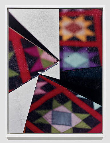 Quinlan’s methods are predicated on the construction of coincidences, from binding transient placements and vantages as photographs, to curating their constellations for presentation. One final piece, Crazy Quilt (2011), fragments the colorful triangular patchwork of a different quilt than seen elsewhere. Its design is only visible in the three panes whose reflections strike directly into the camera lens (rather than ricochet among themselves). Each view is in foggy focus, bounded by the dusty glass’s crisp edges, two of which meet at a chipped point. Is that imperfection a post-human memento mori? The surrogate hand of the artist? A fractal of visual glitches? On the surface it’s a happenstance flaw, and these photographs are all surface, densely compressed. Quinlan’s interest in artifice has consistently been an avenue for looking at its behind-the-scenes actuality. Rather than critique the facades and fetishes these simple apparatuses—old film, mirrors, appropriated images—effect, she exploits them herself to create theater, an emotive art, and an exciting terrain for manipulations.