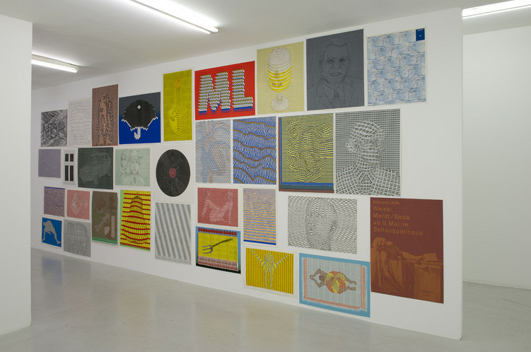 Each one of the thirty-two silkscreens on cardboard, hung together on one big wall of the gallery, presented a variation of Bayrle’s graphic technique. Through the repetition of one chosen miniature hand-drawn figure and the deviation of the positioning of some of those figures, a third element arises in relief: a portrait (Knopfmann, 1972), an object (Maggi Flashe, 1980), or an action (Plistch-Platsch, 1973). Again, distortion appears as a tool of disturbance, manifesting, like the peaks of an electrocardiogram, the unpredictable rhythm of living things resolutely resisting the mechanistic logic of serial production.