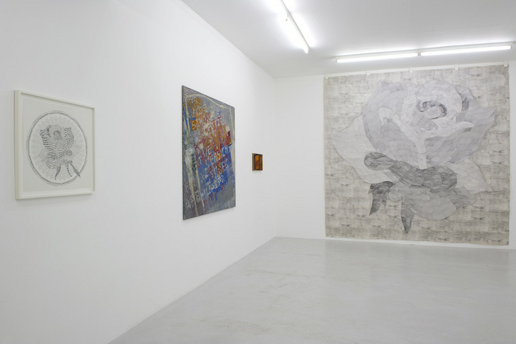 For his second exhibition at Air de Paris, Thomas Bayrle presented three series of works from different periods of his career. Following a logic of inverse chronology, the exhibition proposed a progressive dive into the history of Bayrle’s work, from his most recent grey cardboards to his more colorful paintings, resulting in a panorama of the meticulous aesthetic research that crosses the decades of Bayrle’s artistic practice. Crosses, or one should rather say, criss-crosses, for Bayrle’s approach is criss-crossed with one essential thread, namely his taste for interlacing, networks, and patterns directly inherited from his craftsman’s know-how: as a young employee of a weaving factory, he learned what would later become his trademark visual code delineating individual and collective experience.