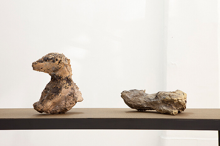 Three other sculptures take the ethical question to a similar, if more problematic extreme. Entitled Cheval à chair perdue (Horse of lost flesh) and Chien et chienne à chair perdue (Dog and bitch of lost flesh), these bronzes were also poured in Burkina Faso, where the artist produces works. They consist of one horse head and two truncated dog’s bodies whose realism issues from the fact that they were cast, using the lost wax technique, from real animals, hence the title of the show (“A Carne Perdida” or “to lost flesh”). However, their realism is complicated by their extraordinarily rich texture, which features shards of unburnt coal, bronze, and random parts of metal, a byproduct of using recycled (as opposed to pure) bronze. Obviously, not for the faint of heart or animal lovers, these awesome and terrifying objects bring to mind both Pompeii’s dog and the unsettling Gothicism of Berlinde De Bruyckere’s equine sculptures.