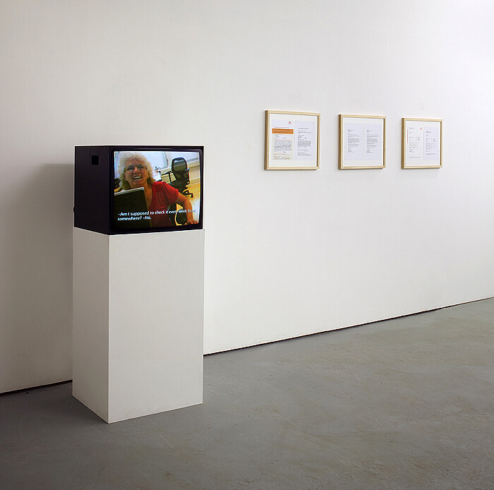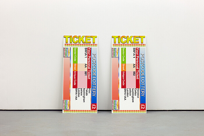 In her current show, “Random Numbers” at Carlos/Ishikawa, Takala continues her ongoing observation of insular belief systems and their, at times, arbitrarily imparted rules, presenting two works that focus on the world of chance games and how the inherent logic of the number game seeps into social consciousness. One in a Million (2012) comprises three videos accompanied by two oversized lottery tickets and the related correspondence. The connecting theme is the postcode lottery game, a subscription lottery that operates via the drawing of postcodes. The format was first established in the Netherlands in 1989 and has since expanded to Great Britain and Sweden. The installation follows two narrative threads, the first being a case of lottery fraud in the Netherlands, in which a woman demands compensation for the temporary dispensation of her postcode and the resulting damages from having paid to participate in the lottery without the chance of winning. The result is an absurd conversation with the lady from the local council authority that reveals the impenetrable jungle of the bureaucratic chain of command. The second strand chronicles Takala’s attempts to register with the UK lottery under the postcode for Buckingham Palace, SW1AA 1AA. Both projects follow the painful negotiations with local authorities and the comical correlations between luck and postcode, or, much more, fortune and being fortunate.