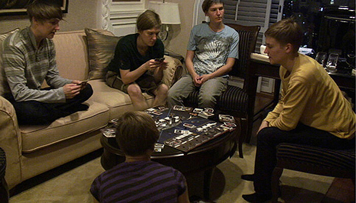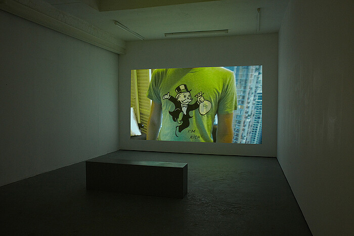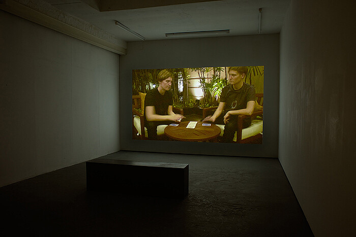 The other work in the show, the short video Players (2010), portrays the laid-back life of an enclave of Scandinavian online poker players based in a hotel (known in poker circles as the “Scandi Tower”) in Bangkok. Financially enabled by the success of their online poker games, the group live out a lifestyle of luxury and thrills, or, as they call it, “being baller.” “Baller” refers here to the extravagancies their lifestyle affords them, a term that can mean anything from renting out private helicopters to having ice cubes made of ice tea in their ice tea. Narrated by Jaakko or Jasu, his online identity, the video shows how flipping and betting has infiltrated the life of the group not only as a strategy of earning a living, but also as a mode of decision making and gaining consensus that replaces “old fashioned” modes of reason and argument. The piece differs from Takala’s previous works in that the body of the artist no longer intervenes, challenges, or probes, but instead illustrates a condition: all six men are played in the video by Takala herself. These avatar characters present an insightful take on the blurred identities of the players. She stands in as a literal body double for men whose lifestyle depends on daily interactions via an avatar.