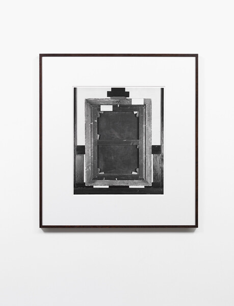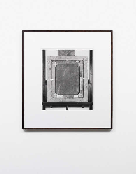 In its most literal sense, “hindsight” would imply seeing the back of something, the behind. Byrne’s 2013 series of silver gelatin prints—such as Inventory number 3280, a depiction of the martyrdom of St. Quirinus, photographed in the Belvedere Museum, Vienna, 219 years after it was painted, and reproduced here at 68% of its original size—depict the backs of framed canvases, in a continued reference to Cornelius Gijsbrechts’s 1670 trompe-l’œil Reverse Side of a Painting, the back of which Byrne photographed in 2008. A further distancing occurs here, however, as Byrne portrays these paintings as held on easels, and the black-and-white prints themselves are surrounded by mat board. No longer trompe-l’œil, these images register double modes of representation, not only to the history of painterly realism but also to contemporary photographic documentation, the kind that validates the authenticity of works. In making visible what is usually concealed, the relation between image and object is brought to the fore, a premise the sculptural work John Brown’s gallows, from existing photographs (after Noguchi) (2013) takes literally in reconstructing a photograph of Noguchi’s theater prop into an object.
