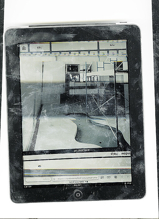There are two iPads as part of the artworks gathered in the International Center of Photography (ICP)’s third photography triennial, entitled “A Different Kind of Order.” Thomas Hirschhorn’s Touching Reality (2012) is a video that gives a frame to a hand scrolling through images of dead, severely injured, and mutilated victims of war in the Middle East. Images include splattered brains, body parts, and internal organs no longer internal. As the hand pauses over them, it pinches and expands certain images or scrolls back to previous ones. It’s a seeing hand of sorts. Though horrifying, the three-plus levels of mediation—initial image, image downloaded to an iPad and manipulated, image and iPad recorded—mute the images slightly, which would seem to be part of the point. What makes Hirschhorn’s work in general so curious is that unlike most other socially engaged artists, who either create propaganda or seek to counter it, he designs the space around it, but does very little to the propaganda itself (the artist’s background in advertising, in which the object isn’t altered, only the environment for it, probably contributes to this). By putting the resources for propaganda into play—whether war atrocities or the writings of Antonio Gramsci—Hirschhorn short-circuits the relationship between ideology and the gaze.