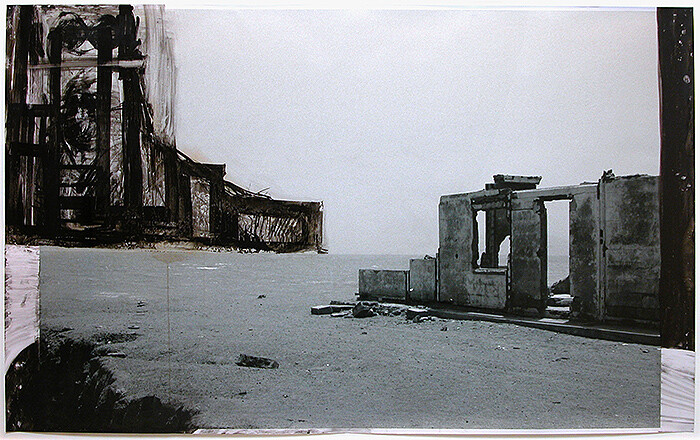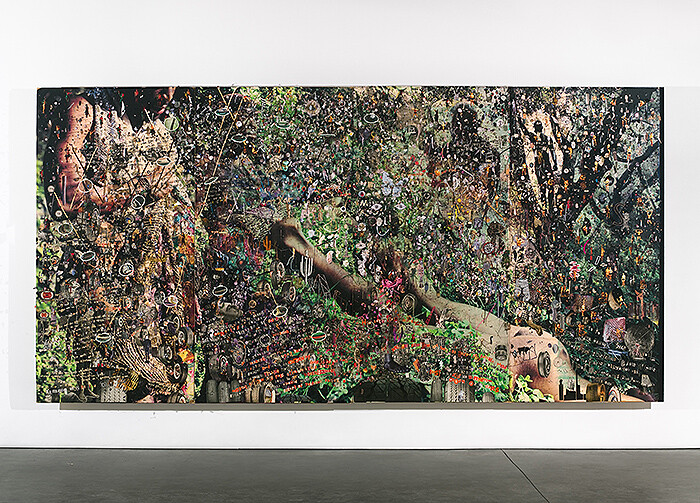 The other iPad appears in work by Andrea Longacre-White that seeks to respond to the institutional context. She took digital photographs of ICP’s interior and transferred them to an iPad, which was then scanned face down. The resulting three large photos on display (all 2013) contain distorted reproductions of the architectural interior, the immediately recognizable tablet screen (complete with fingerprints), and the scan’s stark white background. The look feels a bit messy and collage-like, even if, as with Hirschhorn’s contribution, this is (again) the result of degrees of mediation—image, its scan, then enlarged print. But, in fact, the hand-produced (and hand-produced looking) is one of the main themes running through “A Different Kind of Order,” and the exhibition opens with a few of these: Mishka Henner’s Dutch Landscapes (2011), which substitute colorful geometric abstractions over sensitive areas the Dutch government ordered blurred when photographed by Google Earth; Huma Bhabha’s drawings on photographs she’s taken of ruins around Karachi; and Elliott Hundley’s Pentheus (2010), a large-scale collage of images and texts, with scattered cutout figures protruding from the surface of the work with pins. In retelling—and dismembering—Euripides’s presentation of the Dionysus myth, Hundley introduces another important theme of the exhibition: the body, both under threat and yet like a return of the repressed, asserting its fleshy, messy self into technology’s increasingly shiny sheen.