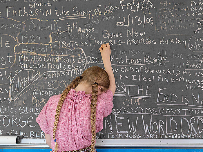 Lucas Foglia’s A Natural Order collects photographs he took of individuals and groups creating alternative economies, communities, and cultures outside of mainstream U.S. society. A couple generations ago, these might have been hippies living on communes, but one of the striking aspects of these works is how they isolate the individual—a bare-chested man in the woods with his possum stew (2006), an exhausted girl standing at a homeschool chalkboard (2008). There’s a rugged individualism (even in the group portraits), and not much sense of infrastructure. One wonders how long these survivalists will actually survive. A very different sense of individualism appears in Nayland Blake’s extensive installation, Knee Deep in the Flooded Victory (2013), combining photographs, publications, and small objects from his personal collection and the ICP archives celebrating gay liberation. As the only artwork in “A Different Kind of Order” that viewers are forced to physically negotiate, Blake’s contribution breaks with what throughout the exhibition feels like last century’s—i.e., static—mode of viewing. The World as Will and Representation (2007), Roy Arden’s hour-and-a-half-long video of circa 28,000 digital images organized by subject—while obviously impressive—is only the most extreme example of this relatively passive spectatorship.