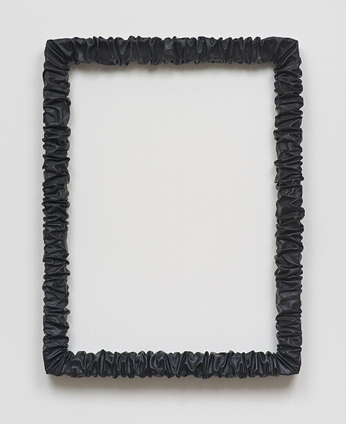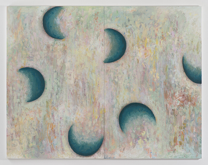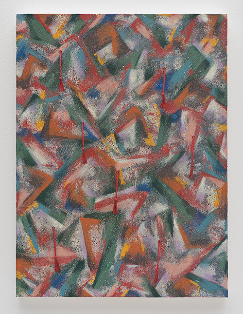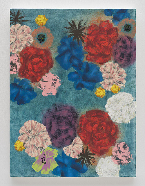 Around the corner, past a couple of real people tapping at a table, the next room hosts a party of pencil points and bite marks, smeary flowers, and nine fleshy gray cans strung from a rectangle of poplar. This party of patterns beams like prints on Pee-Chee folders and posters of Degrassi Junior High hanging in the background (from the design-forward art directors of Canadian TV). I keep thinking of this as a sleepover of teenage girls costumed in their mothers’ dresses, 1970s and 80s vintage specimens that they filched out of the mothballs and donned for some vaguely cheesy fun, worn with more glee than smirk. These are paintings with shoulder pads that are ill-fitting, but with nothing to prove aside from their own jaunty angles. Their Symbolist floral patterns might easily be cut into a sleek sheath for a wayward vamp or an evening frock for a Hausfrau, but I heard that the artist calls these flowery arrays “palette cleansers”—just a means to smear away old paint, rubbing out a brush into dreamy daubs.