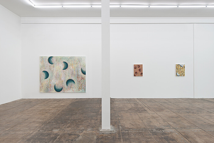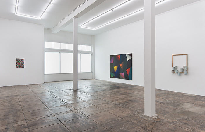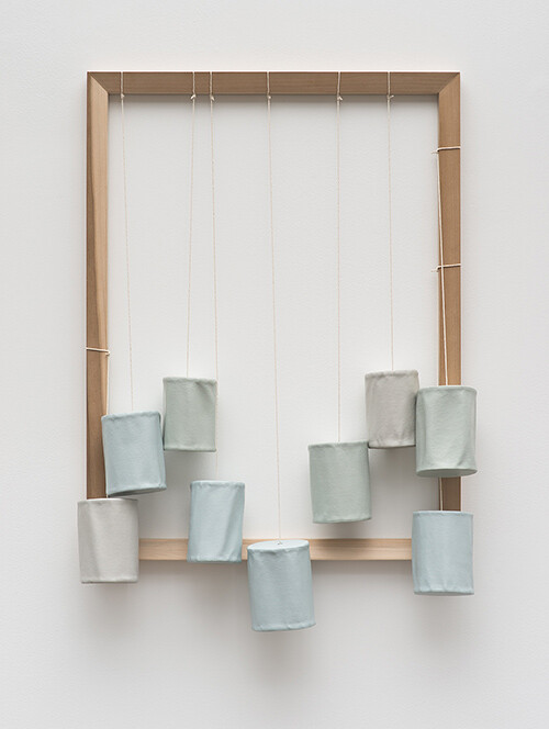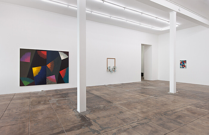 These are really paintings after all, though anything can happen in painting. The simple rules are set out with simple materials. A rectangle on a wall. Canvas, wood, paint, maybe a few staples or nails to keep it all tacked in place. That’s a painting. This simple set, this frame for a picture is the picture. Everyone always forgets about the frames, the woven fabric, easily unraveled, or the wood of the stretcher bars cut—we’re too busy trying to soak in the picture to be dazzled by expressions of emotion or precise prowess. (Though we don’t crop out the frames of paintings in photographs anymore, now do we?) But once the stage is set, anything you fill into it will be read as a painting—whether it’s those nine cans hanging with canvas strings from naked wood, or an overlapping eight points of pastel-smeary points of color (the only primary colors to be found in a muddy wash of tertiary hues throughout). The colors and shapes replicate some bit of applied art. Molzan folds the pejoratively decorative (and distinctly unhip) patterns of the defanged abstractions meant for dresses or wallpaper, folders or bed sheets (the most distant, prodigal descendants of Kazimir Malevich) back into the fine art family with sly humor and elliptical grace.