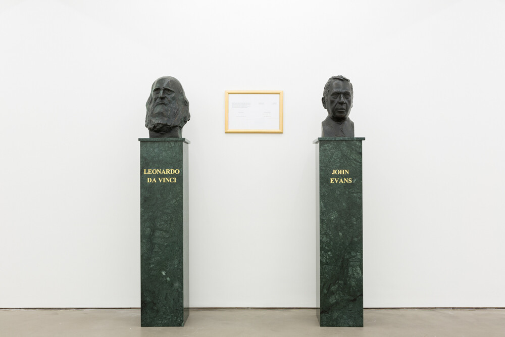 John Foster (1972) is another twist on the “Casual Passers-by” project; Dimitrijević installed a memorial marble plaque of his sitter on the façade of a house as is typical of famous historical figures. About Two Artists (Leonardo – Evans) (1988), a third variation on the theme, is a showdown of two marble busts, one bearing the effigy of Leonardo da Vinci and the other with the semblance of another John Doe who, as a framed text certificate duly informs us, was also painter, but sank into obscurity. Dimitrijević returns time and again to the issue of celebrity, questioning the reasons why some names are written into history, while the talents of many unknown men and women go unnoticed. With its insistent vindication of the everyday man, it comes as no surprise that late Swiss curator Harald Szeeman included an iteration of “Casual Passers-By” in the “Individual Mythologies” section of his 1972 Documenta 5.
