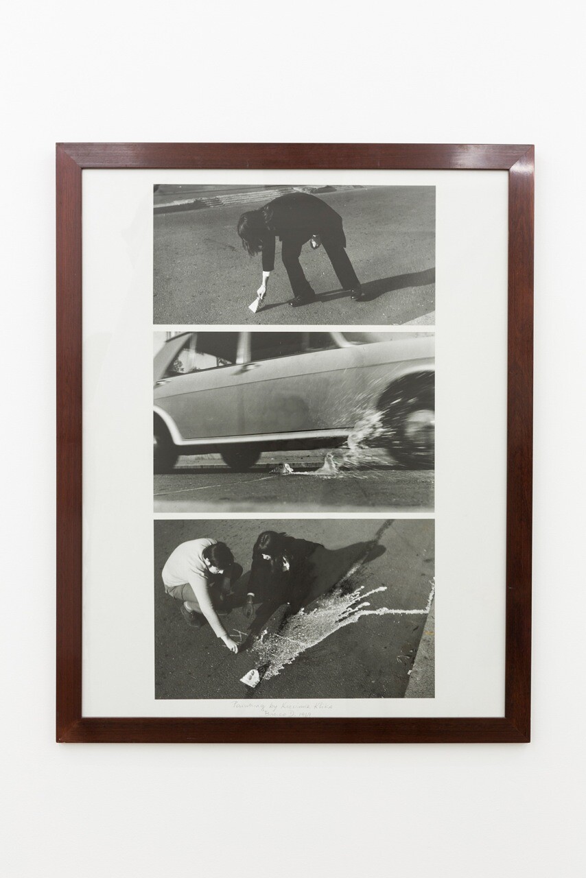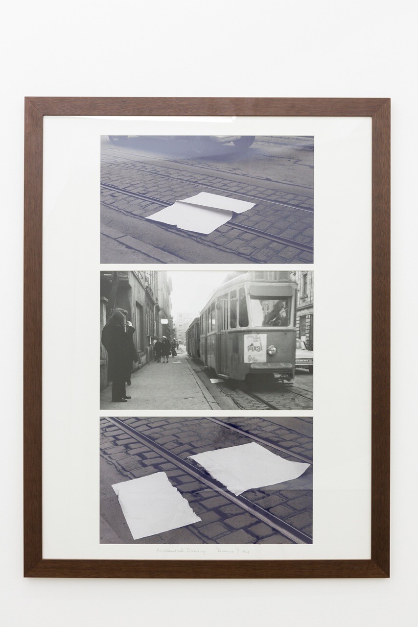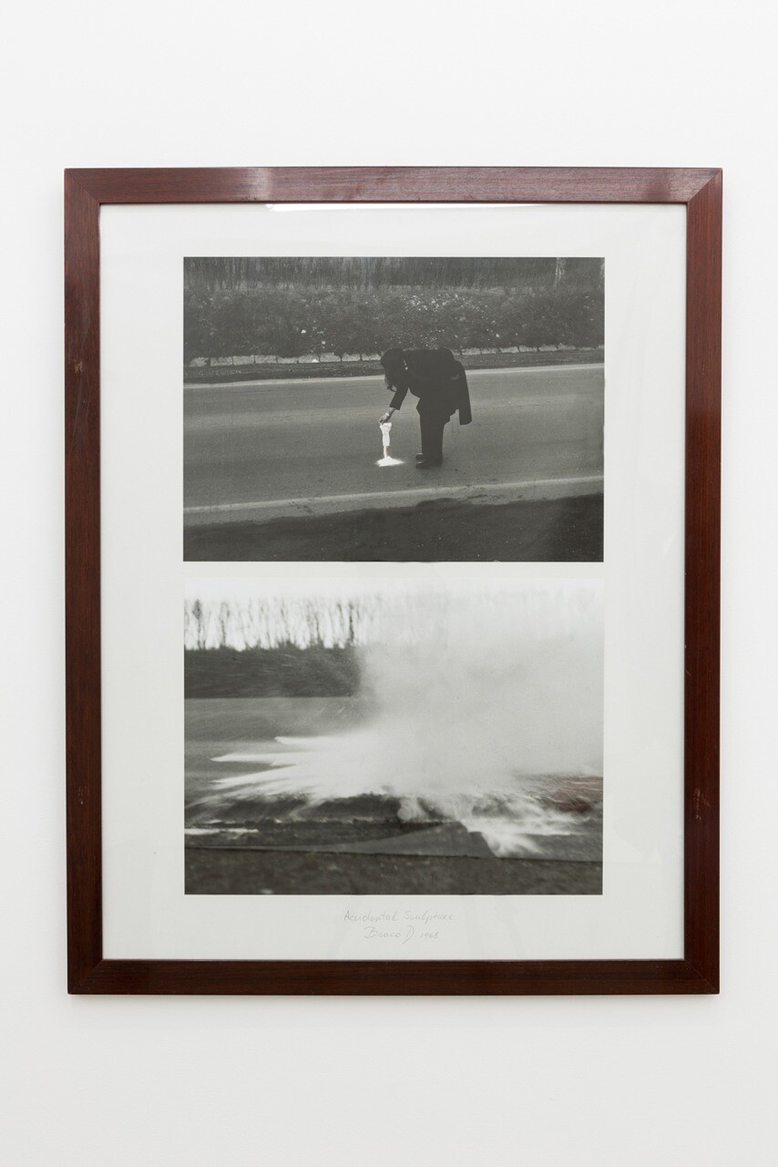When a 23-year-old Dimitrijević enrolled in the postgraduate course in the sculpture department at St. Martin’s School of Art in London in 1971, he had already accumulated substantial artistic experience. As the son of Vojo Dimitrijević, a celebrated painter from the former Yugoslavia, he grew up amongst his father’s brushes and canvases, and began exhibiting his work at the age of ten. Wanting to break with traditions (both familial and artistic), he gave up painting soon after and started a practice based on urban interventions. His Accidental Sculpture, Accidental Drawing (both works 1968) and Painting by Krešimir Klinka (1969) are early examples, and are perhaps the most delicate and nuanced works in this exhibition. Dimitrijević would leave materials on the streets and wait for some chance occurrence to turn them into contingent works of art, from a gust of wind turning plaster powder into an ephemeral sculpture to a tram slicing a sheet of paper in two.