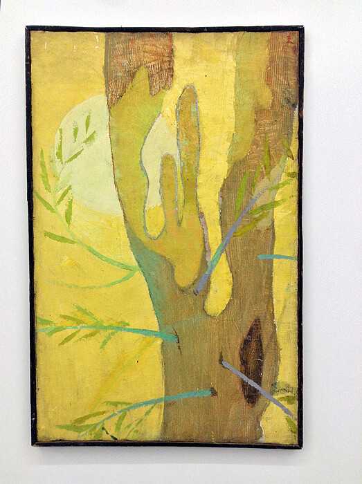 The less politically inclined group of the two, the Wuming Painting Society, produced landscapes en plein air, emulating Impressionist and Fauvist styles. Though heterogeneous in content, the Wuming’s paintings often focused upon the subconscious thoughts and feelings of its maker—a politically charged act in an era of extreme authoritarianism mandating national homogeny via the total compliance of its citizens. The standout painting of the exhibition, Life (1975) by Wuming group outlier Feng Guodong, depicts a melting, yolky yellow tree whose branches appear to be piercing its trunk, as if shot by an outsider.