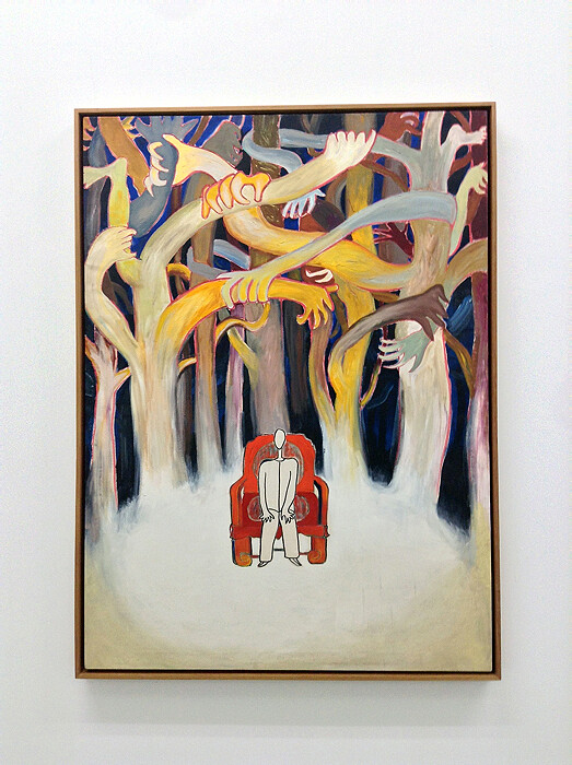 The Stars Group used public space to brazenly confront the Chinese government’s imperious policies, installing their paintings in well-populated parks and even forming a protest in Beijing’s city center. This desire to subconsciously “break free” can be seen in Stars Group member Tang Pinggang’s untitled painting from 1985, in which red hands are stamped on and claw at a black canvas. “It never occurred to us that what we were doing with the Wuming Group and then the Stars Group was anything to write home about,” reflects Stars Group founder Li Shaung, who has since expatriated to Paris. “I’ve labored, cried, laughed, been in prison, despaired, triumphed, and in the end—quite naturally and unwittingly—we laid the cornerstone for the revival of art in the 1970s.”1 Her curious painting, Thinking (1981), depicts an isolated, genderless figure sitting in a forest of limbs wrestling each other, and recalls the melancholic landscapes of American painter Charles Burchfield.