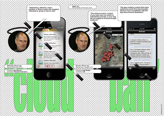 It is highly unlikely that Drones+ was banned after direct government interference. But it isn't difficult to imagine an informal, unstated, and rather intuitive constellation of interests between Apple—universally praised by US politicians on both sides of the aisle—and the US Government. Shared interests and informal ties between private enterprise and government, based on mutual forms of “Like,” rather than strict separations by Law, may account for de facto forms of censorship in the cloud, without the explicit order to enact it or the explicit obligation to justify it. In December 2010, Apple removed a WikiLeaks iPhone app from its store, citing its developer guidelines: “Any app that is defamatory, offensive, mean-spirited, or likely to place the targeted individual or group in harms [sic] way will be rejected.”59 Simultaneous to the WikiLeaks app being banned, other US cloud companies, including Amazon and PayPal, stopped providing services to WikiLeaks.