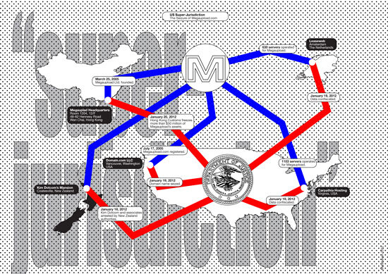 The site's founder, thirty-seven-year-old internet millionaire Kim Dotcom, and three of his associates were brought to a New Zealand court to face extradition to the US. They’d been living like self-styled oligarchs. In a gesture toward transparency, they said they had “nothing to hide.”21 In particular, Dotcom himself embodies the absurd saga of a contemporary, deeply self-parodying internet hooligan—a legal black hole turned persona, unprepared in every way to be “famous,” yet accepting the challenge wholeheartedly. Megaupload.com was, at least in its own self-imagination, nothing more than a technical conduit between those who upload and those who download, its content-indiscriminate policy a typical example of laissez-faire anarcho-capitalism. The US government’s prosecution of the site remains highly debated, because the DOJ interpreted the site’s global user base as a willful conspiracy to break US law. As Jennifer Granick at Stanford Law notes, the DOJ referenced “unknown parties” (i.e., the users of Megaupload.com) as members of a conspiracy to conduct a crime in the US. Granick notes that such users “were located all over the world, and may or may not have acted willfully.” Indeed, with Megaupload.com, the government alleges “an agreement to violate a US civil law, including by many people who are not subject to US rules.” As Granick then asks, “Does the United States have jurisdiction over anyone who uses a hosting provider in the Eastern District of Virginia? What about over any company that uses PayPal?”22 Indeed, these are the sorts of questions prompted by super-jurisdiction.