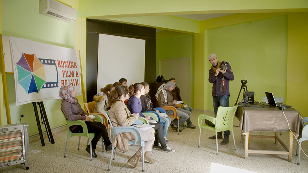 An undated press release from the Rojava Film Commune, founded in 2015, states: “The most valuable outcomes of the cinema will be delivered to the peoples of Rojava in their own languages. We shall not allow the cinema to be simplified to become an industrial tool, or a consumable and exhaustible object. The squares of our villages will become our culture and art centers. Our factories and our restaurants will become cinema halls. Our vibrant streets will be our films sets.”