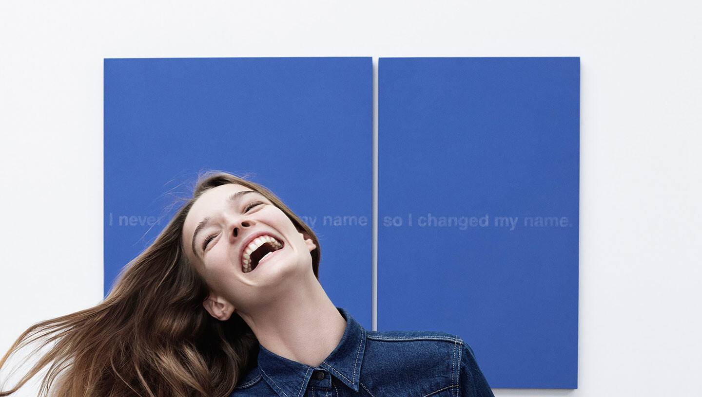 Image from "Introducing the Calvin Klein Campaign: American Classics" In this advertisement is accompanied by the following caption: "Ricard Prince, I Changed My Name, 1988. Copyright: Richard Prince Acrylic and screenprint on canvas (142.5cm x 198.7cm) Calvin Klein: Classic Demin Shirt (Calvin Klein Jeans Est. 1978) Photographed at Rubell Family Collection, Miami