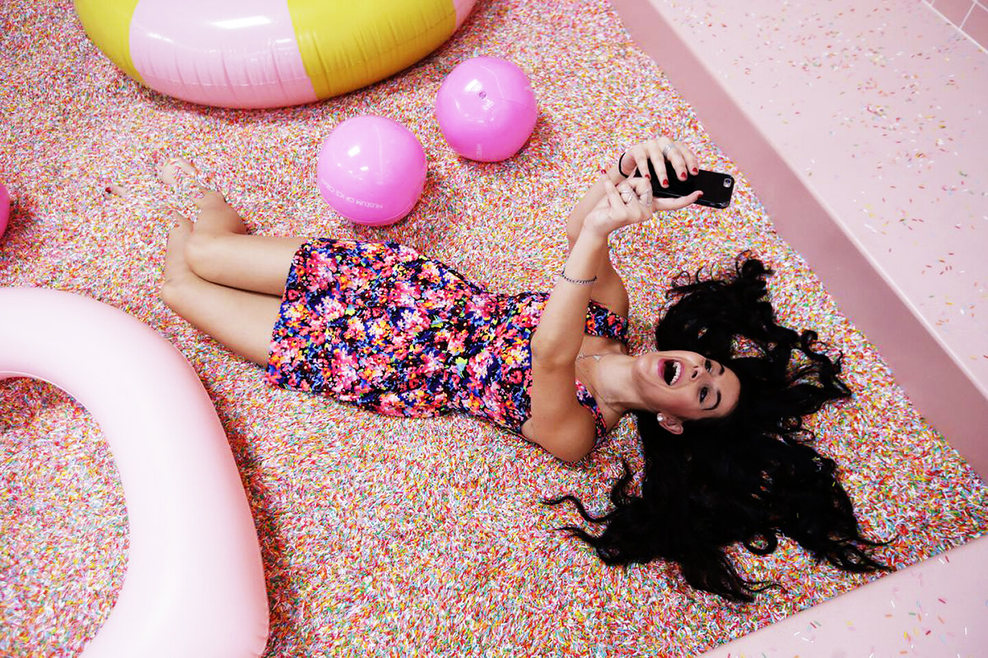 Deidre Behar takes a selfie in a pool of sprinkles at the Museum of Ice Cream, a pop-up art installation in Los Angeles. Photo: Glenn Koenig / Los Angeles Times
