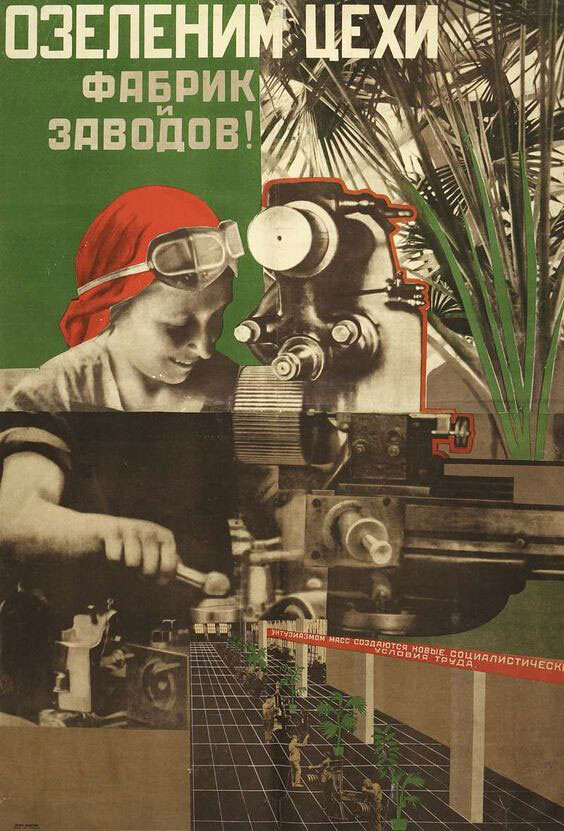 Soviet poster, date unknown. The poster reads: “We will green [used as a verb] the shops, the factories, the [power] plants!”